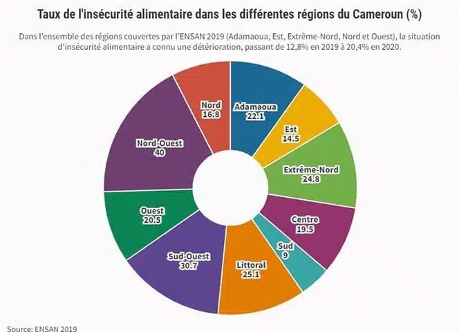 Plus d’un million d’enfants de moins de cinq ans souffrent d’un retard de croissance . Cet état les empêche d’atteindre leur plein potentiel de développement et conduit à des résultats scolaires inférieurs, à une capacité de travail réduite, à un potentiel de revenus inférieur et à une vulnérabilité accrue aux maladies chroniques à l’âge adulte. Les régions les plus touchées par le retard de croissance sont l’Extrême-Nord, le Nord, l’Adamaoua et l’Est, avec des taux respectifs de 41,9 %, 33,8 %, 37,8 % et 35,8 %. Il existe des disparités de retard de croissance entre les différents quintiles de richesse, les milieux urbains et ruraux (22,8 % dans les zones urbaines contre 38 % dans les zones rurales) et les différents niveaux d’éducation maternelle. Le retard de croissance est presque trois fois plus élevé chez les enfants du quintile le plus pauvre (41,6 %) que chez ceux du quintile le plus riche (14,3 %), et cinq fois plus élevé chez les enfants nés de mères sans instruction (38,8 %) que chez ceux ayant un niveau d’instruction plus élevé (7,5 %). D’après l’enquête Standardized Monitoring and Assessment for Relief and Transition (SMART), réalisée en 2019 par la délégation régionale de la Santé publique (Minsanté) et l’UNICEF avec l’appui financier de KFW, dans le cadre de la surveillance nutritionnelle, « 5,5% des enfants de moins de 5 ans souffrent de la malnutrition aigüe globale.
